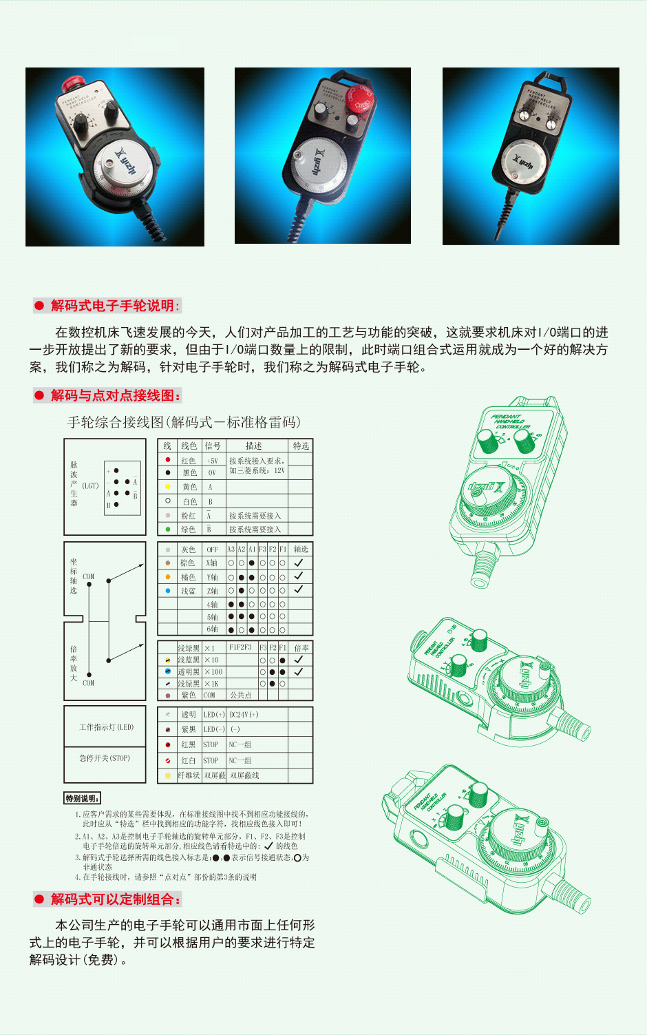 ● 本公司承接定制各种功能的手轮如:手轮面板上可加入多个按键以扩展手轮在多功能上的需求(可在15-20天内交货),特此说明