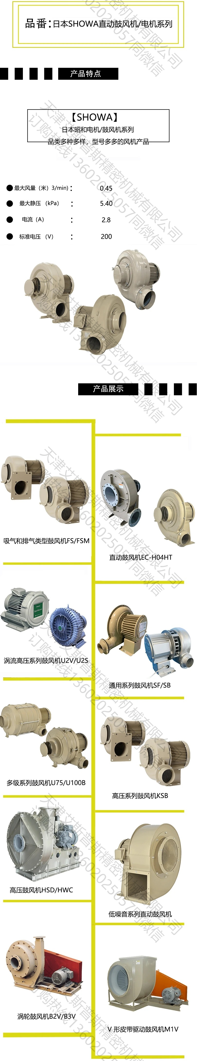 昭和电机株式会社(SHOWA DENKI CO LTD),成立于1950年,电动送风机的专业生产商,拥有世界最领先的气流技术,产品广泛地使用于通风机械,热风机,工业炉,印刷机,机床,包装机,制冷机及燃烧器等工业行业,昭和电机产品还有工业风扇,吸雾器及集尘器等行业,昭和吸雾器广泛地使用于机床行业。
