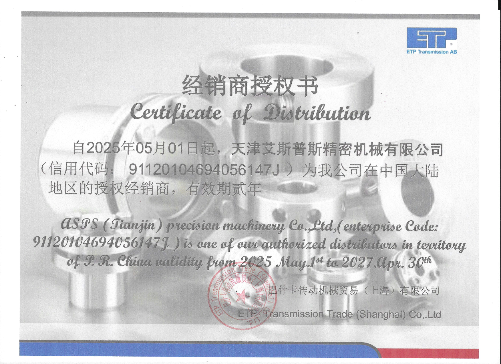瑞典 ETP Transmission AB 中国全资子公司巴十卡授权经销商:天津艾斯普斯精密机械有限公司:负责ETP品牌在中国市场的销售和售后服务,我们经营的产品有各种高端涨紧套,免键胀套,液压轴套,液压刀柄,ER液压接头,膨胀芯轴等,所有产品均为瑞典制造,具有高精度,可靠性强,技术领先,操作简便,国内提供质保等优点,还可按用户要求特殊订制。